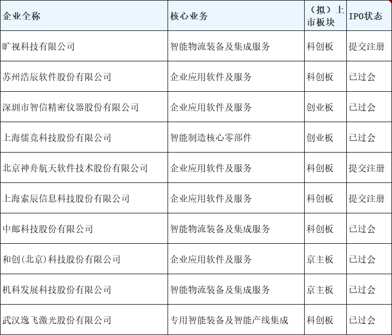 已过会的企业:6月,AMR供应商旷视科技科创板提交注册,上市在即;7月研发设计类工业软件提供商浩辰软件科创板IPO过会;9月,消费电子自动化设备供应商智信精密创业板IPO过会;10月,变频节能与智能控制应用方案提供商儒竞科技创业板IPO过会;11月,航天工业软件服务商神舟航天软件、CAE软件服务商索辰科技、智能物流装备及系统集成商中邮科技科创板过会;12月,CRM厂商和创科技(红圈CRM)、智能物流装备及集成服务提供商机科股份京主板已过会,精密激光加工智能装备供应商逸飞激光科创板IPO顺利过会。