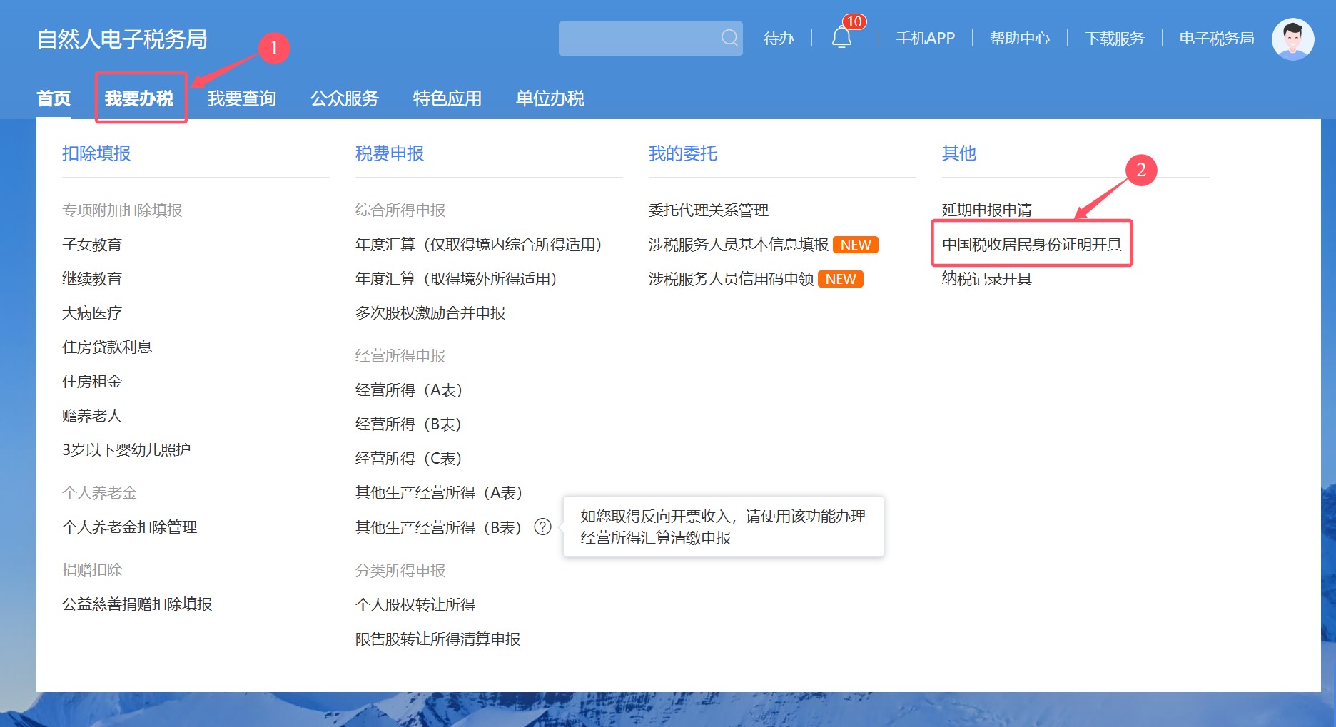 依次点击:【我要办税】 —> 【其他】 —> 【中国税收居民身份证明开具】。